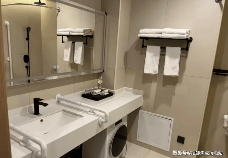 公寓总建筑面积广阔,绿化覆盖率极高,宛如一座城市中的绿洲。室内采用全屋适老化设计,走廊宽敞明亮,双侧安装人体工学扶手,地面铺设防滑地胶,确保长者行走安全。房间内配备可升降护理床、防滑地胶、紧急呼叫系统及独立新风系统,卫生间采用无障碍设计并安装助力扶手与恒温花洒,为长者打造一个安全、舒适的居住环境。