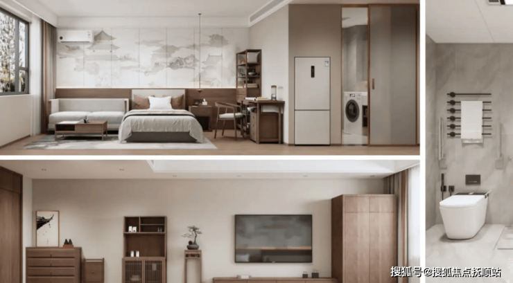 居室标配:智能护理床、独立卫浴、恒温花洒、折叠助浴椅、智能马桶、24 小时紧急呼叫系统、中央空调、新风系统